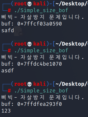 우선 함수를 살펴보면 v4의 사이즈가 엄청난걸 확인할 수 있다. 무려 27,952 (0x6D30) 바이트다. gets 함수에서 BOF가 발생하는데 그 전에 printf 함수에서 v4의 주소를 출럭해준다. 한번 실행을 해보자