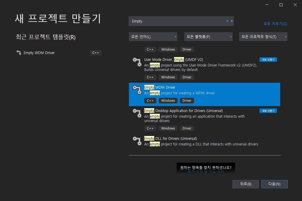 이렇게 Visual Studio 프로젝트 만들기에 Empty WDM Driver 라는 템플릿이 생성되었다면 성공적으로 윈도우 커널 드라이버 개발 환경이 준비된 것이다.