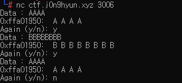 main 함수를 보니 이번에는 친절하게 s의 버퍼가 128 바이트라고 명시되어 있다. scanf를 이용하여 개행문자(엔터)가 나오기 전까지 입력을 받고 현재 버퍼의 주소를 출력 후 16바이트 만큼 문자를 출력한다. 그 이상 문자가 있다면 그 다음 주소를 출력하고 또 다시 16바이트 만큼 출력하는 걸 반복하는것 같다. 한번 입력을 시도한 후 출력이 끝나면 다시 입력할건지에 대한 질문이 나온다. 코드만 봐서는 자세히 알 수 없으니 한번 실행을 해보자