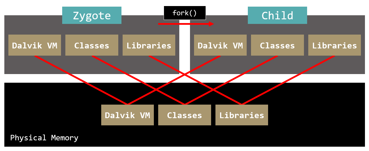 안드로이드에는 Zygote(자이고트)라는 이름의 프로세스가 존재하는데 Zygote는 애플리케이션이 실행되기 전에 가상 머신의 코드 및 메모리 정보를 공유함으로써 애플리케이션이 실행되는 시간을 단축시킬 수 있다.