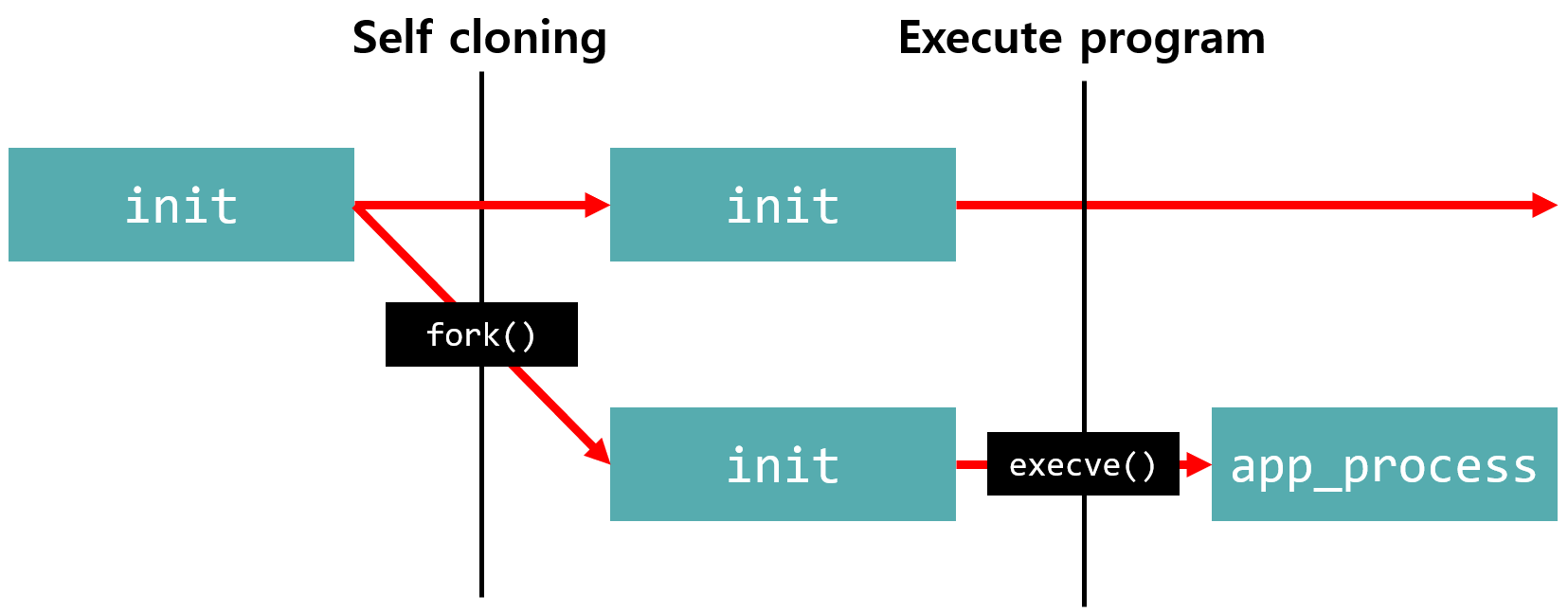 Zygote는 init 프로세스가 자기 자신을 fork() 함수를 통해 복제한 뒤 execve() 함수를 통해 app_process를 실행하는 방식으로 실행된다.