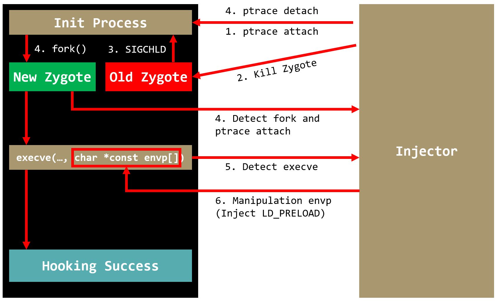 init 프로세스를 이용해 Zygote 프로세스에 LD_PRELOAD 환경 변수를 삽입하는 순서는 다음과 같다.