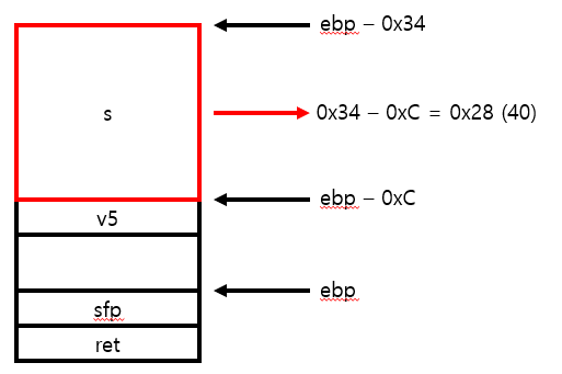 s부터 v5까지의 거리는 0x34 - 0xC = 0x28 총 40바이트이다. 즉 s의 공간은 40바이트이다.