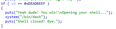 아래쪽 if 문에서 v5가 0xDEADBEEF 라면 Shell을 띄워준다. fgets에서 45바이트를 입력받으므로 s를 40바이트로 모두 채우고Buffer OverFlow 발생시켜 v5를 조작해 Shell을 얻어낼 수 있다.