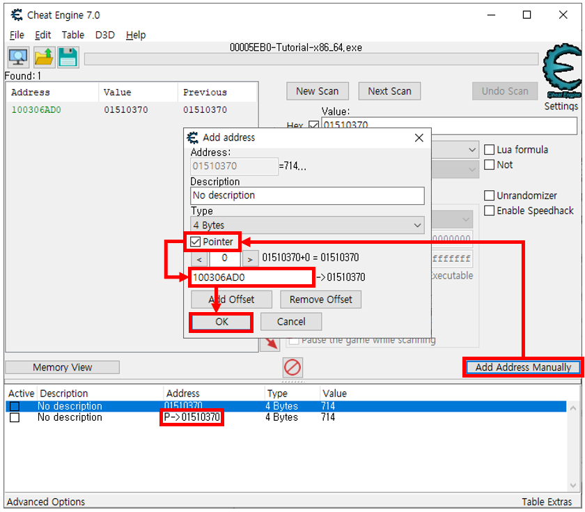 Add Address Manually -> Pointer 체크 -> 아까 구한 주소 값을 작성 -> OK -> 리스트에 P->주소 형태로 저장