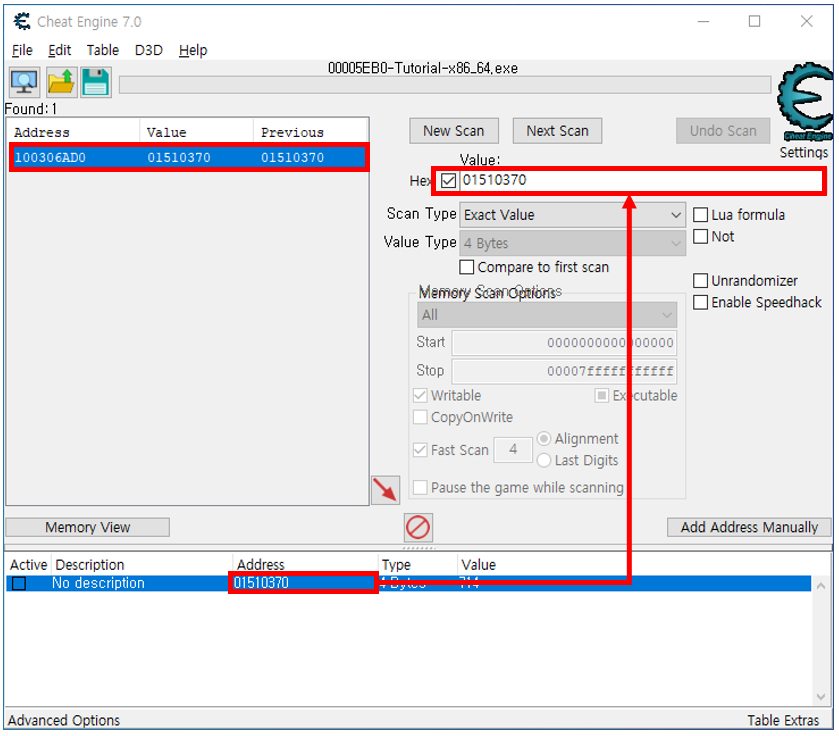 새로 구한 주소를 Value에 넣어주는데 그 전에 앞에 Hex에 체크를 하자 Hex는 16진수 값이나 주소를 검색할 때 사용하는 옵션이다. 그리고 Scan을 하면 우리가 검색한 주소를 가지고 있는 주소가 나오게 된다. 0x100306AD0가 진짜 Change pointer를 눌러 주소가 바뀌더라도 바뀐 주소를 가지고 있는 주소이다. 이 주소를 외워두자 그리고 다음과같이 진행한다.