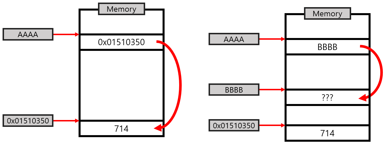 위 그림처럼 우리가 찾은 주소는 0x01510350 이다. 그리고 AAAA라고 하는 공간에 그 주소가 저장되어 있다. 프로그램 내부에서는 값을 변경할 때 AAAA에 접근하여 값을 변경한다. 하지만 Change pointer를 누른순가 AAAA에는 새로 공간의 주소가 들어가게 된다. 그러면서 값이 저장되는 위치가 기존 0x01510350에서 다른 공간으로 바뀌게 된다. 그렇기 때문에 우리가 찾은 0x01510350은 더 이상 사용하지 않게되면서 값을 저장하는 공간이 아니게 되어 버린것이다. 그럼 우리가 Change pointer를 클릭하고나서 값을 5000으로 바꾸려면 값의 주소를 저장하는 AAAA라고 하는 주소를 알아야 한다. 이번엔 바뀐 주소를 다시 구해보자
