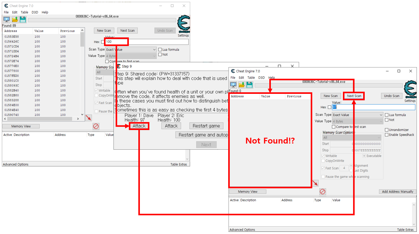 Scan Type을 Unknown initial value로 설정해주고 First Scan 버튼을 눌러준다, 그 후에 Attack 버튼을 눌러 Hit 해주고 이번에는 Scan Type을 Decreased value (감소된 값)으로 설정해준 후 Next Scan 버튼을 누르면 기존에 값에서 감소된 값들을 보여주게 된다. 위 방법을 반복해 플레이어들의 체력을 찾을 수 있다.