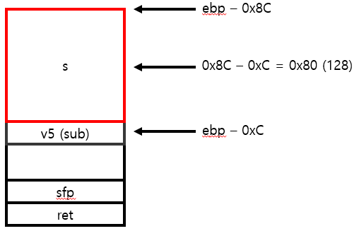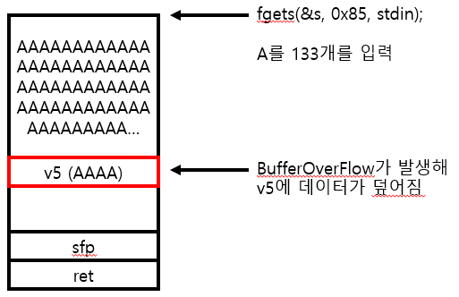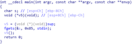 코드를 보면 변수 s와 함수 포인터 v5가 선언되어 있다. s는 배열인것으로 보인다. 그리고 v5에 sup라는 함수의 주소를 넣고 fgets를 이용해 s에 133(0x85)바이트 만큼 입력을 받은 후 v5에 들어있는 함수를 실행한다.