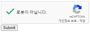 이후 웹 사이트를 가동시켜 접속해보면 정상적으로 reCAPTCHA가 적용되어 있는 모습을 볼 수 있다,