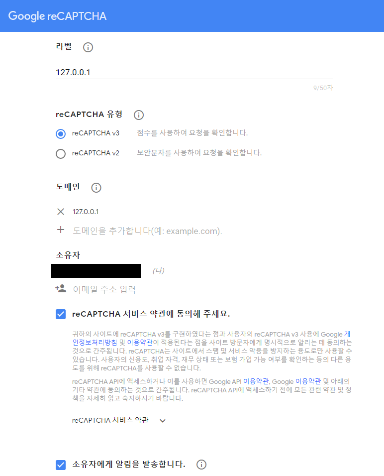 RECAPTCHA_SECRET_KEY = '비밀 키'