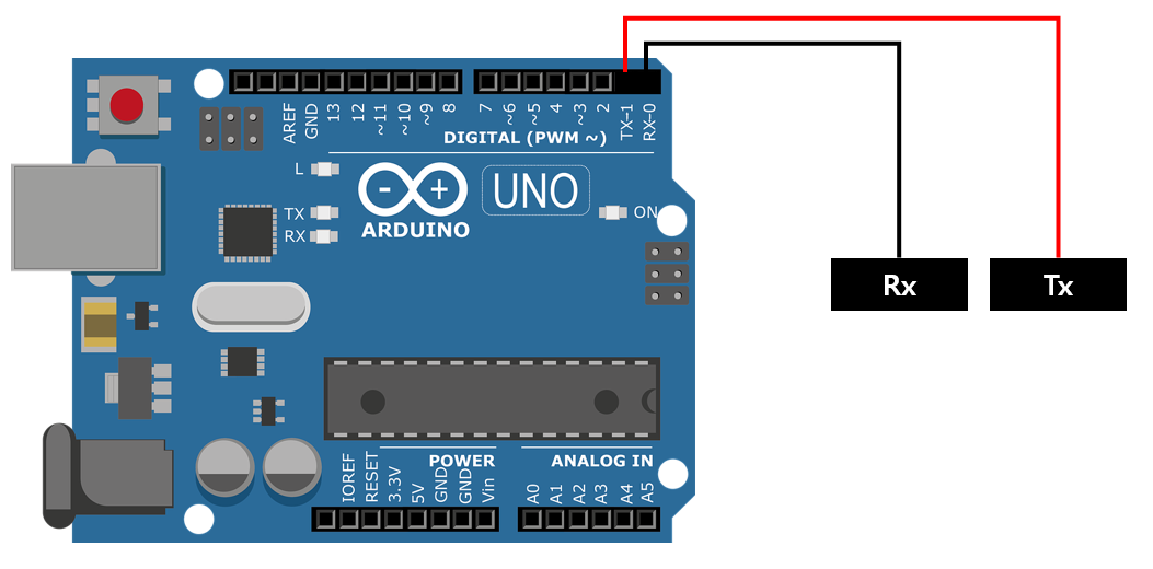 그런데 위 코드를 보면 첫번째 인자로 PIN_TX가 들어가있다. 이는 잘못된 것이 아니라. 시리얼 포트에서 첫번째 인자는 데이터를 수신할 핀이다. 그렇다면 다른 장치의 Tx와 연결해줘야 하는 것이다. 다음 그림을 보면 이해가 보다 쉬울 것이다.