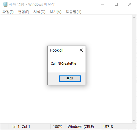 이렇게 DLL Injection이 성공했다면 메모장에서 [파일] -> [열기] 를 클릭하면 다음 그림과 같이 메시지 박스가 성공적으로 나오는 것을 확인할 수 있다.
