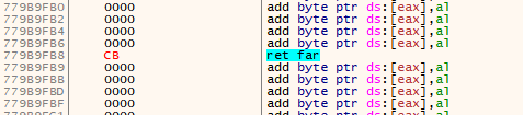 Opcode 0xCB를 사용하는 리턴 어셈블리이다. 해당 어셈블리는 CS 레지스터를 변경한다.