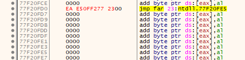 즉 위 어셈블리에서 이동할 주소인 0x77F20FE5가 상대적으로 계산되어 있지 않다. 그리고 두번째 Operand로 해당 주소가 존재하는 Code Segment를 받았다. 해당 주소는 CS 0x0023에 존재하는 주소이기 때문에 0x0023으로 설정했다. 위 어셈블리를 실행하게 되면 CS Register의 값이 0x0023으로 변경되고 0x77F20FE5로 EIP가 이동하게 된다.