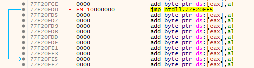 opcode인 0xE9가 존재하고 상대거리인 0x00000010이 operand로 들어가 있다. 해당 어셈블리 명령의 동작과정은 EIP(IP)에 operand를 더하는 방식으로 계산된다. (혹시라도 0x77F20FE5 주소로 점프하는지 이해가 안된다면 아래 접은 글을 확인하자)
