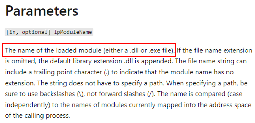 GetModuleHandleA가 NULL을 반환하는 이유는 MSDN을 확인해보면 알 수 있다.