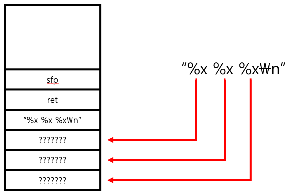 (32bit 기준) 스택은 다음과 같이 생성된다. 마지막 인자부터 순서대로 스택에 쌓고 함수를 호출한다. 그렇게 되면 printf 함수는 첫번째 인자로 들어온 문지열을 분석한다. 서식문자를 보고 그 위치에 맞게 인자로 들어온 변수를 출력하게 된다.
