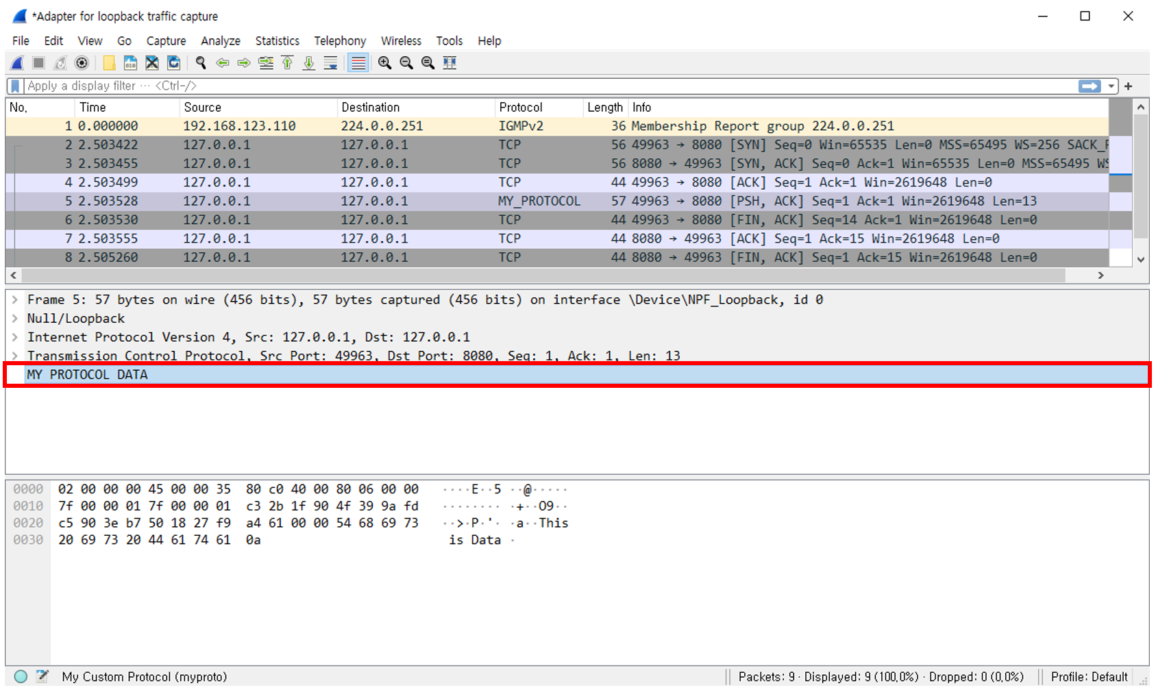 위 코드는 TCP 프로토콜의 포트가 8080일 경우 MyProto로 설정한다는 말이다. 이렇게 설정하게 된다면 8080 포트로 통신하는 모든 TCP 패킷들이 MyProto.dissector 함수를 거치게 된다.
